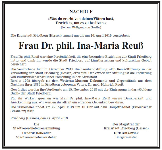 Nachruf Dr. phil. Ina-Maria Reuß, 25.9.1941 - 10.4.2019